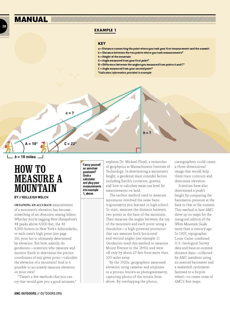 Obtaining an accurate measurement of a mountain’s elevation has become something of an obsession among hikers. Whether you’re tagging New Hampshire’s 48 peaks above 4,000 feet, the 46 4,000-footers in New York’s Adirondacks, or each state’s high point, your list is ultimately determined by elevation. But how, exactly, do geodesists—scientists who measure and monitor Earth to determine the precise coordinates of any given point—calculate the elevation of a mountain? And is it possible to accurately measure mountain elevation on your own?