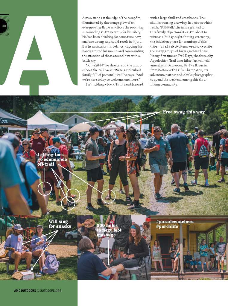He’s holding a black T-shirt emblazoned with a large skull and crossbones. The skull is wearing a cowboy hat, above which reads, “Riff-Raff,” the name granted to this family of personalities. I’m about to witness a Friday-night shirting ceremony, the initiation phase for members of this tribe—a self-selected term used to describe the many groups of hikers gathered here. It’s my first time at Trail Days, the three-day Appalachian Trail thru-hiker festival held annually in Damascus, Va. I’ve flown in from Boston with Paula Champagne, my adventure partner and AMC’s photographer, to spend the weekend among this thru-hiking community.