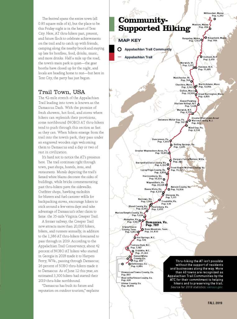 A former railway, the Creeper Trail now attracts more than 20,000 hikers, bikers, and runners annually, in addition to the 1,386 AT thru-hikers forecasted to pass through in 2019. According to the Appalachian Trail Conservancy, about 42 percent of NOBO AT hikers who started in Georgia in 2018 made it to Harpers Ferry, W.Va., passing through Damascus; 26 percent of SOBO thru-hikers made it to Damascus. As of June 12 this year, an estimated 3,300 hikers had started their 2019 thru-hike northbound.