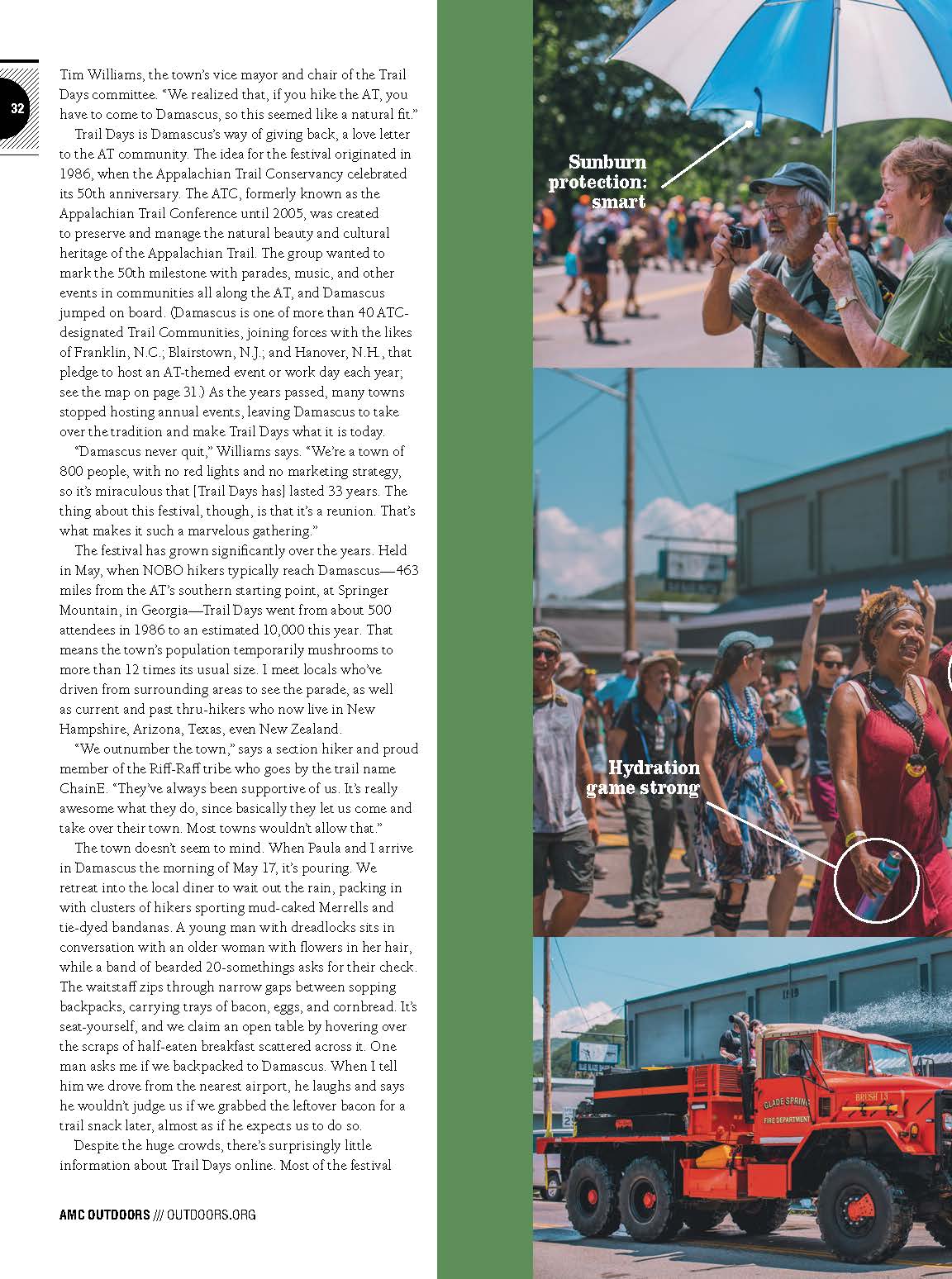 Trail Days is Damascus’s way of giving back, a love letter to the AT community. The idea for the festival originated in 1986, when the Appalachian Trail Conservancycelebrated its 50th anniversary. The ATC, formerly known as the Appalachian Trail Conference until 2005, was created to preserve and manage the natural beauty and cultural heritage of the Appalachian Trail. The group wanted to mark the 50th milestone with parades, music, and other events in communities all along the AT, and Damascus jumped on board. (Damascus is one of more than 40 ATC-designated Trail Communities, joining forces with the likes of Franklin, N.C.; Blairstown, N.J.; and Hanover, N.H., that pledge to host an AT-themed event or work day each year; see the map on page 31.) As the years passed, many towns stopped hosting annual events, leaving Damascus to take over the tradition and make Trail Days what it is today.