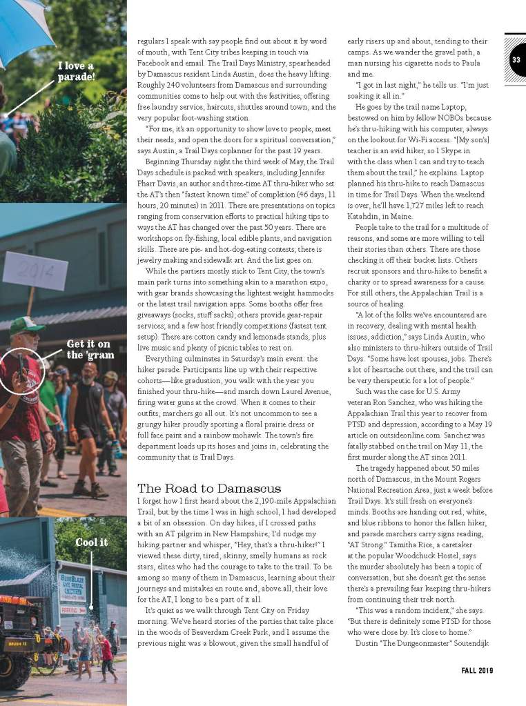 The festival has grown significantly over the years. Held in May, when NOBO hikers typically reach Damascus—463 miles from the AT’s southern starting point, at Springer Mountain, in Georgia—Trail Days went from about 500 attendees in 1986 to an estimated 10,000 this year. That means the town’s population temporarily mushrooms to more than 12 times its usual size. I meet locals who’ve driven from surrounding areas to see the parade, as well as current and past thru-hikers who now live in New Hampshire, Arizona, Texas, even New Zealand.